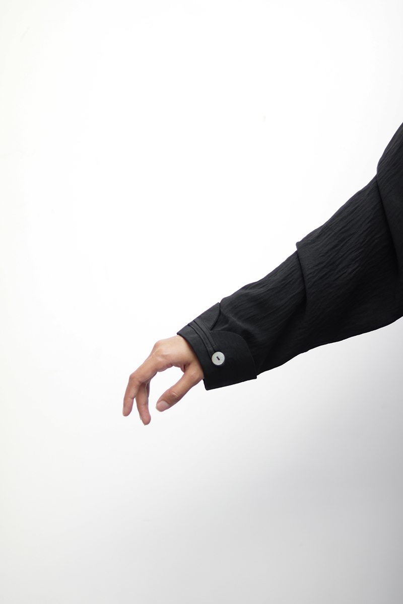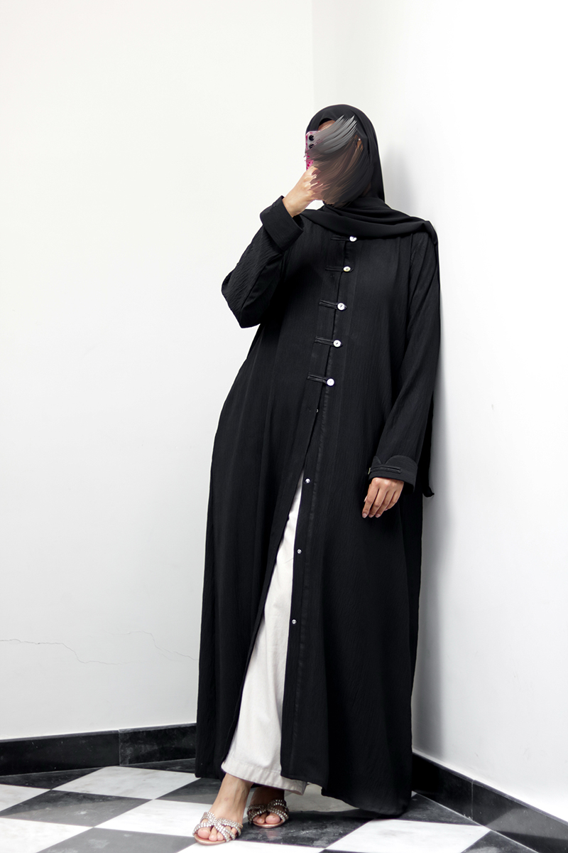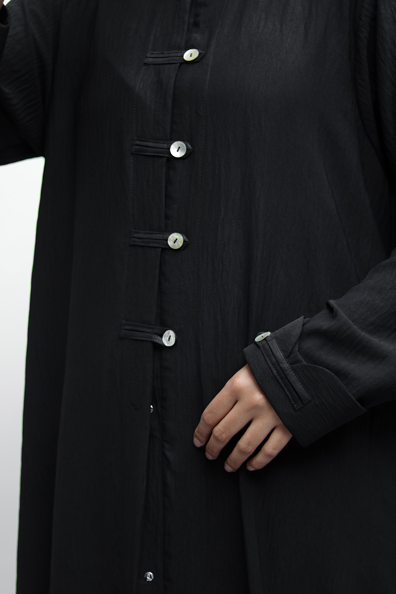 The Buttonline is the minimal chic abaya version of a Mandarin/Tang jacket. It is defined by its silhouette, a refined collar and a front line of loop and statement buttons that shape the entire look. Perfect for the girl looking for a modern structured cut.